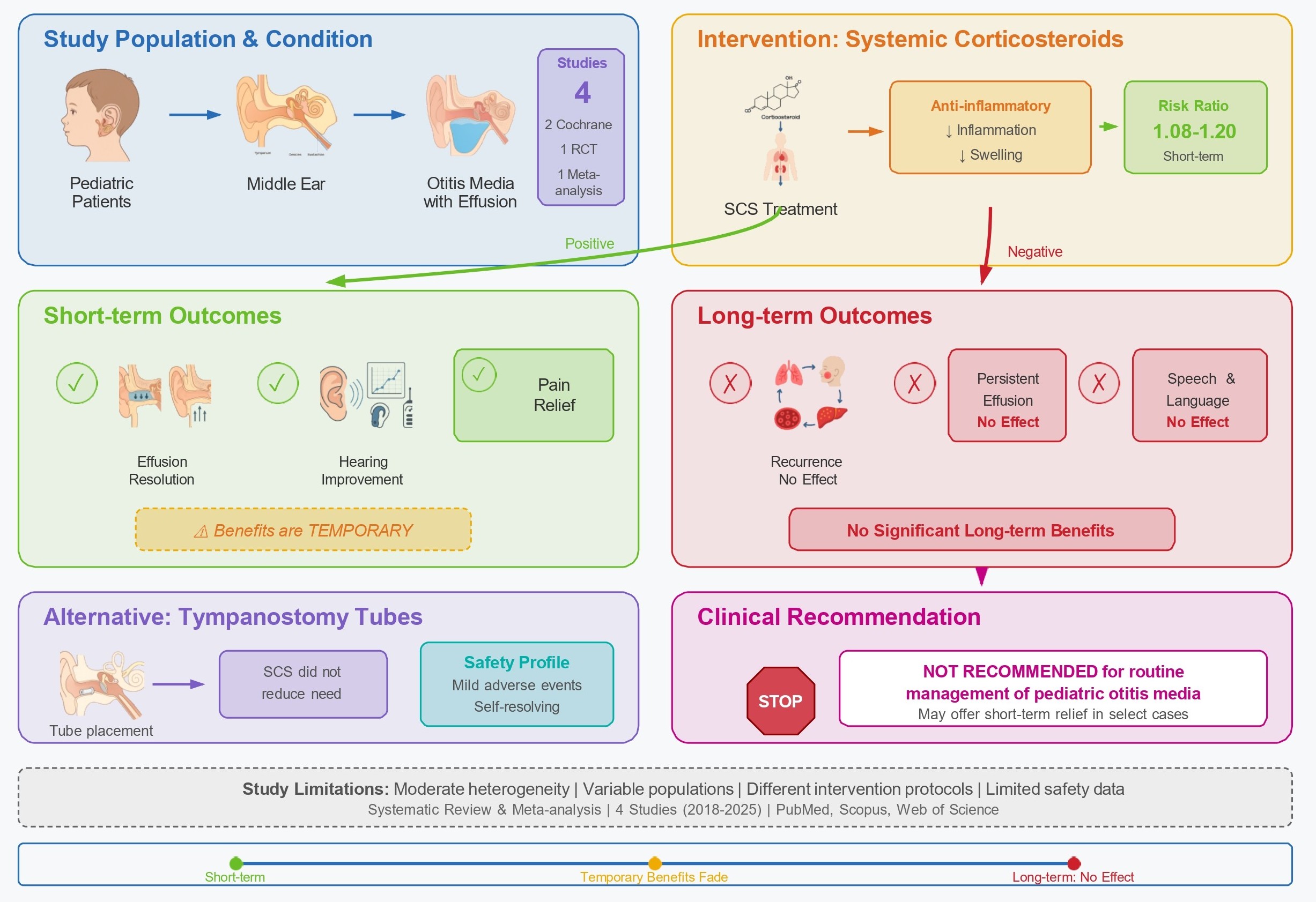 Otitis media is a common childhood condition that affects public health because of its frequency, recurrence, and potential long-term consequences. This systematic review and meta-analysis assessed the efficacy and safety of systemic corticosteroids (SCS) in children with acute otitis media and otitis media with an effusion. A comprehensive search of PubMed, Scopus, and Web of Science identified relevant studies published between January 2018 and August 2025. The primary outcomes were effusion resolution, hearing loss, and otitis media recurrence. Secondary outcomes included pain relief, tympanostomy tube placement, speech and language development, quality of life, and adverse events. Four studies, including two Cochrane reviews, one randomized controlled trial, and one meta-analysis, were analyzed. The results showed that SCS provided short-term improvements in effusion clearance and hearing, with risk ratios from 1.08 to 1.20. However, these benefits were temporary, with no significant long-term effects on recurrence rates, persistent effusion, or developmental outcomes. Safety data were limited, with most adverse events being mild and self-resolving. The studies had moderate heterogeneity due to differences in population characteristics, intervention protocols, and outcome definitions. Results suggest that SCS may offer short-term symptom relief in certain cases but cannot be recommended for routine management of pediatric otitis media. Future research should prioritize large-scale multicenter trials with standardized outcomes, extended follow-up periods, and thorough safety assessments to identify the subgroups that might benefit the most from SCS treatment.