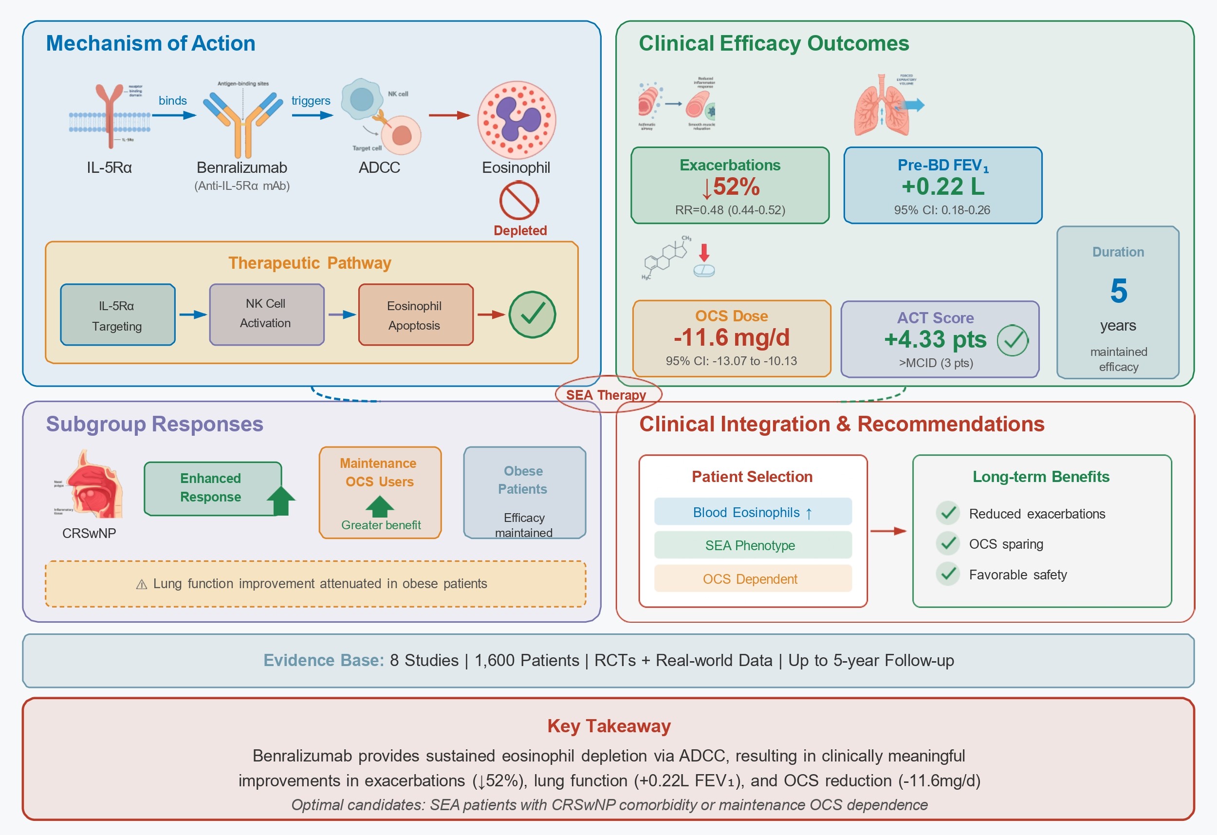 Benralizumab is an interleukin-5 receptor α-directed monoclonal antibody that depletes eosinophils via antibody-dependent cell-mediated cytotoxicity. This systematic review and meta-analysis evaluated the efficacy and safety of benralizumab in patients with severe eosinophilic asthma (SEA) using evidence from randomized controlled trials, post hoc analyses, and real-world studies. Eight studies comprising 1600 patients were included in this review. Benralizumab significantly reduced the risk of severe exacerbations by 52% (Risk Ratio [RR] = 0.48, 95% confidence interval [CI]: 0.44–0.52) and decreased the maintenance oral corticosteroid (OCS) dose by 11.6 mg/day (95% CI: −13.07 to −10.13). Lung function improved, with a mean increase of 0.22 L in pre-bronchodilator forced expiratory volume in one second (95% CI: 0.18 to 0.26). The asthma control test scores increased by 4.33 points (95% CI: 3.69 to 4.98), surpassing the minimal clinically important difference. These benefits were observed in both randomized controlled trial extensions and real-world studies and were maintained for up to five years, with a favorable safety profile. Subgroup analyses revealed greater improvements in patients with chronic rhinosinusitis with nasal polyps and those receiving maintenance OCS. Benralizumab efficacy was maintained in obese patients, although improvements in lung function were attenuated. These results support the use of benralizumab as a long-term treatment for SEA, particularly in patients with comorbidities or those requiring maintenance OCS. The integration of benralizumab into personalized management plans based on biomarkers and clinical phenotypes can optimize outcomes in SEA.