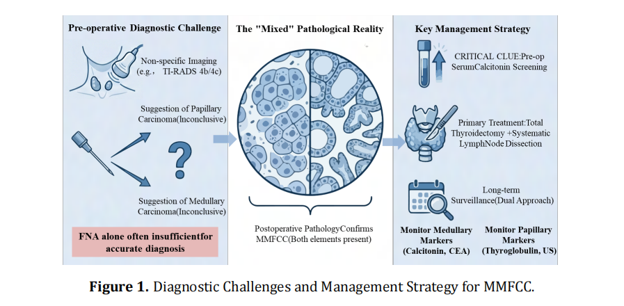Mixed Medullary and Follicular Cell Carcinoma (MMFCC) is a rare thyroid cancer combining medullary and follicular (often papillary) elements. The lack of standard clinical signs and imaging characteristics makes it difficult to diagnose before surgery. At present, the main approach to treatment is surgical removal, and the outlook for patients is primarily influenced by how advanced the medullary carcinoma is. We report two cases of MMFCC confirmed by postoperative pathology. Case 1 involved a 46-year-old woman with bilateral thyroid nodules and left cervical lymph node metastasis. Preoperative ultrasound classified the nodules as TI-RADS 4c, and fine-needle aspiration cytology suggested papillary thyroid carcinoma. Total thyroidectomy with bilateral neck lymph node dissection was performed. Postoperative pathology revealed MMFCC, with a medullary component accounting for approximately 95% and extensive lymph node metastasis. Six weeks postoperatively, serum calcitonin was 73.00 pg/mL. Case 2 involved a 54-year-old man presenting with neck pain. Ultrasound showed a hypoechoic left thyroid nodule (TI-RADS 4b) with bilateral cervical lymphadenopathy. Fine-needle aspiration suggested medullary thyroid carcinoma, and serum calcitonin and carcinoembryonic antigen levels were markedly elevated. Following total thyroidectomy with bilateral neck lymph node dissection, pathology confirmed MMFCC with an approximately 80% medullary component. Postoperative tumor markers decreased significantly, and long-term follow-up was initiated. MMFCC is a rare thyroid carcinoma with considerable diagnostic difficulty. Fine-needle aspiration alone may be insufficient for accurate diagnosis, whereas preoperative serum calcitonin testing provides important diagnostic clues. Total thyroidectomy with systematic lymph node dissection is advised, plus long-term monitoring per both carcinoma guidelines.