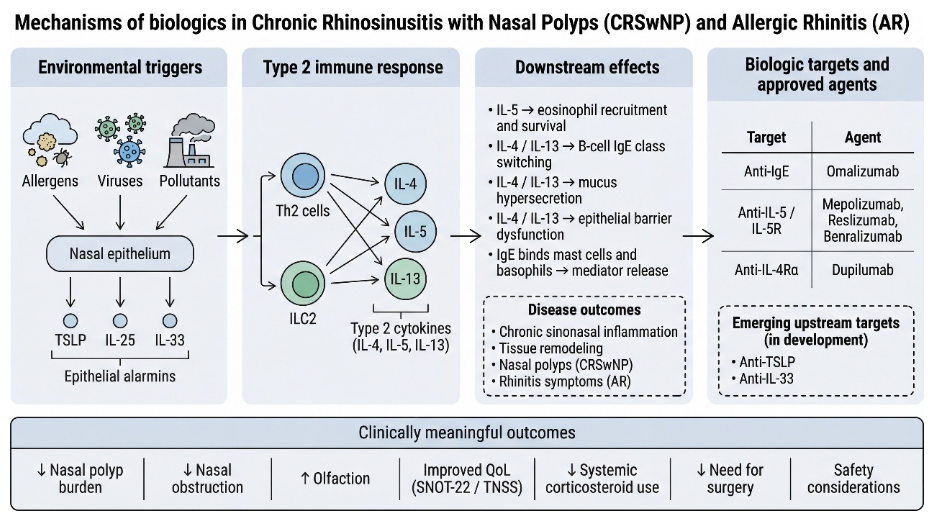 Chronic rhinosinusitis with nasal polyps (CRSwNP) and allergic rhinitis (AR) are common upper-airway inflammatory disorders that often coexist, significantly decrease quality of life, and recur even when treated with intranasal or systemic therapy or surgery. Growing mechanistic insights, such as the role of type 2 inflammation driven by epithelial “alarmins” (TSLP, IL-25, IL-33) and downstream cytokines (IL-4/IL-13, IL-5), together with IgE-mediated effector pathways, have led to the accelerated clinical use of targeted biologics. Here, we summarize the shared immunopathogenesis of CRSwNP and AR, highlight treatable endotypes and practical biomarkers (e.g., blood eosinophils, total IgE, FeNO, and disease-specific symptom and quality-of-life scores), and map these features to therapeutic targets. We summarize evidence for approved agents, including anti-IgE omalizumab; anti-IL-5/IL-5R therapies mepolizumab, reslizumab, and benralizumab; and anti-IL-4R therapy dupilumab, focusing on clinically significant outcomes such as nasal polyp burden, nasal obstruction, olfaction, SNOT-22/TNSS improvement, reduction in systemic corticosteroid use, surgery rates, safety, and limitations. Given that many patients have multimorbidity with asthma or atopic dermatitis, we also outline how unified airway management can guide multidisciplinary decision-making and the use of shared endpoints. Practical considerations such as initiation criteria, response assessment, treatment switching, and economic or access barriers are summarized to inform real-world implementation and future research.