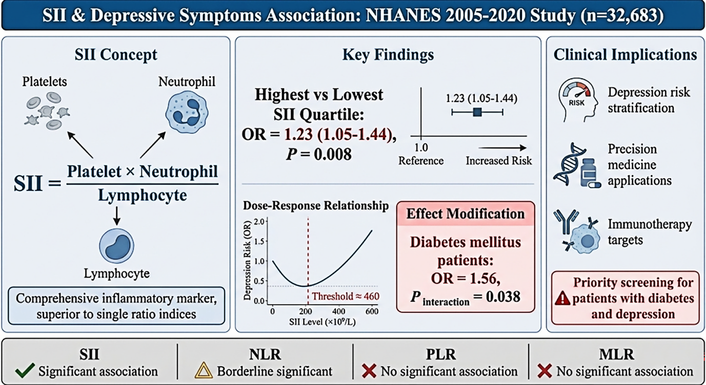 Inflammatory responses play a crucial role in the pathogenesis of depression. The Systemic Immune Inflammatory Index (SII) is a novel composite inflammatory marker that integrates the counts of neutrophils, lymphocytes, and platelets. However, the relationship between it and depressive symptoms is still not very clear at present. This exploratory study conducted in this article aims to investigate the relationship between SII and other immune inflammatory markers, such as the neutrophil-to-lymphocyte ratio (NLR), platelet-to-lymphocyte ratio (PLR), monocyte-to-lymphocyte ratio (MLR), and depressive symptoms. This can provide some epidemiological evidence for intervening in mental health through immune regulation. Data from the National Health and Nutrition Examination Survey (NHANES) 2005–2020, which included 32,683 adults 18 years of age and older, were used in this exploratory cross-sectional analysis. Because this study generated hypotheses, subgroup and sensitivity analyses were carried out, restricted cubic spline (RCS) analysis was utilized to investigate dose-response relationships, and weighted multivariable logistic regression was utilized to evaluate association strength. The highest quartile of SII was significantly associated with elevated depression risk (odds ratio (OR) = 1.23, 95% confidence interval (CI): 1.05–1.44, p for trend = 0.008), with a J-shaped dose-response relationship. The association was stronger among participants with diabetes (OR = 1.56, p for interaction = 0.038). NLR showed a borderline association, while PLR and MLR demonstrated no significant associations. SII was independently and positively associated with depressive symptoms and may serve as a potential biomarker for depression risk stratification, with implications for developing immunomodulatory intervention strategies.