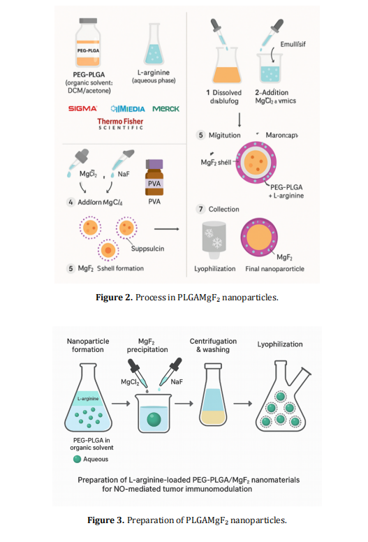 The tumor microenvironment (TME) is an environment that affects the growth, progression, and resistance of the tumor. AI is already transformational in the process of comprehending and attacking the TME. Using datasets with many more variables and different aspects, AI models can predict tumor behavior with greater precision than conventional techniques. In this work, the polyethylene glycol-poly (lactic-co-glycolic acid) (PEG-PLGA) nanoparticles coated with magnesium fluoride (MgF2) and loaded with L-arginine have been developed to modulate the immunity in tumors using nitric oxide (NO). Designed to be released near the TME, PLGA-MgF2 regulates the release of NO, producing an improvement in immune responses against cancer cells. Plasma-polymer coating of PLGA-MgF2 nanoparticles showed an average size of 150 nm with MgF2 shell thicknesses of 12–14 nm and L-arginine loads of 72–75%. The concentrations of NO did not change under the acidic tumor-like conditions, and the concentration was between 25 and 30 µM in the first 48 hours. Transmission electron microscopy (TEM) showed 75–120 particles per square micrometer in the tumor, and the immune cell infiltration increased by 35–45%, and the hypoxia in the tumor decreased by 30–36%. The deep neural networks and support vector machines reached 85–95% accuracy in tumor response classification using AI. The therapy led to 60% augmentation of T-cell activation, 85% tumor growth retardation, 4-fold elevation of the M1/M2 ratio, and 45% longer survival.