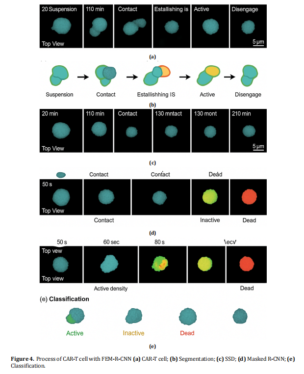 In the immunotherapy process, a machine vision algorithm exhibits an efficient next-generation model for navigating the complex tumor microenvironment with CAR-T cells. With the integration of image-based analysis into the real-time processing algorithm, the system is able to compute spatial guidance for the immune cell, enabling it to detect, eliminate, and infiltrate cells. The variation between computational vision and cellular therapy needs to overcome the issues in the physical and biological barriers of tumors. Hence, in this paper, an effective Fejer Kernel Entropy Masked R-Convolutional Neural Network (FEM-R-CNN) was constructed. The proposed FEM-R-CNN model performs pre-processing of the CAR-T cell using the Fejer Kernel, and segmentation is performed with the entropy model. With the estimated segmentation, the Single Shot Detector (SSD) is employed for the CAR-T cell, and classification is computed using the masked R-CNN for the immunotherapy. Experimental results demonstrate that FEM-R-CNN achieves a cancer cell detection accuracy of 96.2%, a segmentation Intersection over Union (IoU) of 0.86, and a classification accuracy of 94.8%, outperforming traditional models such as U-Net and standard Mask R-CNN by over 5% across key metrics. The model improves signal-to-noise ratio by 46.4% and reduces false positive rates by 53.3%, enabling more precise CAR-T cell navigation. Immune response analysis revealed a CAR-T cell density of up to 150 cells/mm², with a 50% proliferation rate and 72% tumor cell apoptosis, indicating effective immune activity monitoring. The inference time remains competitive at approximately 70 ms per image, supporting near real-time applications.