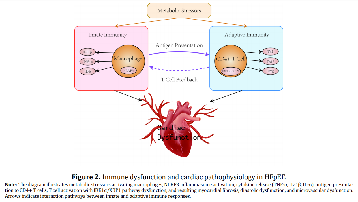 To examine the immunopathological mechanisms underlying heart failure with preserved ejection fraction (HFpEF) in elderly patients and evaluate exercise training as an immunomodulatory intervention for managing disease complications. A narrative literature review was conducted using PubMed, Embase, and Cochrane Library databases (2010–2023), focusing on immune dysfunction, aging, and exercise interventions in HFpEF. HFpEF pathophysiology in elderly patients involves complex interactions between innate and adaptive immunity, characterized by elevated pro-inflammatory cytokines, NLRP3 inflammasome activation, and immune cell dysfunction. Major complications—frailty syndrome, sarcopenia, and malnutrition—share common inflammatory pathways that perpetuate disease progression. Exercise training fundamentally alters this inflammatory profile through multiple mechanisms: suppressing pro-inflammatory cytokine production (TNF-α, IL-1β, IL-6), promoting anti-inflammatory immune cell phenotypes, and enhancing tissue regenerative capacity. Unlike pharmacological interventions targeting single pathways, exercise exerts pleiotropic effects across the immune-inflammatory network, simultaneously addressing cardiac dysfunction and systemic complications. Structured exercise programs effectively interrupt inflammatory cascades, improve functional capacity, and enhance quality of life in elderly HFpEF patients. Exercise training represents a cornerstone intervention that directly targets the fundamental immunopathology of HFpEF. Implementation of specialized exercise-based cardiac rehabilitation programs tailored to elderly patients is urgently needed to optimize clinical outcomes in this growing population.