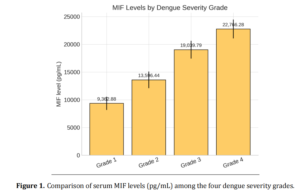 Dengue remains a leading cause of child mortality in Indonesia. Identifying reliable biomarkers to predict disease severity is essential for early intervention. Macrophage Migration Inhibitory Factor (MIF) is a pro-inflammatory cytokine involved in the pathogenesis of dengue. This study aimed to assess the relationship between MIF levels and dengue severity in children, and to compare  the predictive value of MIF levels with C-Reactive Protein (CRP) and serum albumin levels. A cross-sectional study was conducted on 104 pediatric dengue patients hospitalized at Saiful Anwar General Hospital. Serum levels of MIF (ELISA), CRP, and albumin were measured upon admission. Patients were categorized into four severity grades (Grade 1–4) and also stratified into shock and non-shock groups. Statistical analyses included ANOVA, correlation analysis, and receiver operating characteristic (ROC) curve evaluation. MIF levels showed a significant stepwise increase with disease severity and were significantly higher in patients with shock (p < 0.001). CRP levels were also elevated in severe dengue, but the correlation with severity was moderate (r = 0.61, p < 0.05). In contrast, serum albumin levels were inversely associated with severity (r = –0.67, p < 0.05), with lower values observed in the shock group. ROC analysis demonstrated that MIF had the highest predictive accuracy for shock (AUC = 0.94), compared to CRP (AUC = 0.78) and albumin (AUC = 0.81). MIF is a robust biomarker for predicting dengue severity and shock in children, outperforming CRP and albumin in diagnostic performance. The integration of MIF with conventional markers may improve early risk stratification and clinical decision-making in pediatric dengue.
